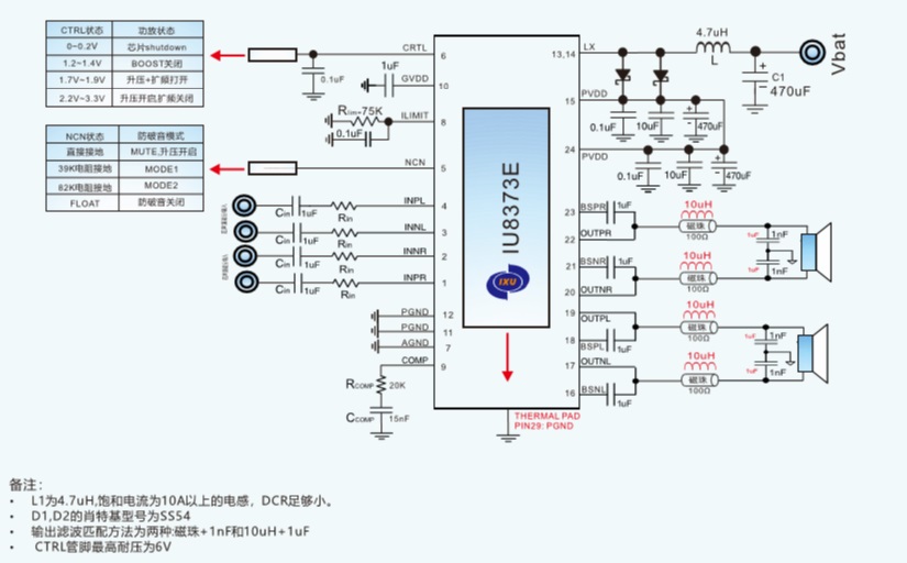 當(dāng)前位置:首頁(yè)->產(chǎn)品展示->功放IC->IU8373(兩節(jié)鋰電8.4V供電內(nèi)置升壓20W立體聲D類功放IC) |