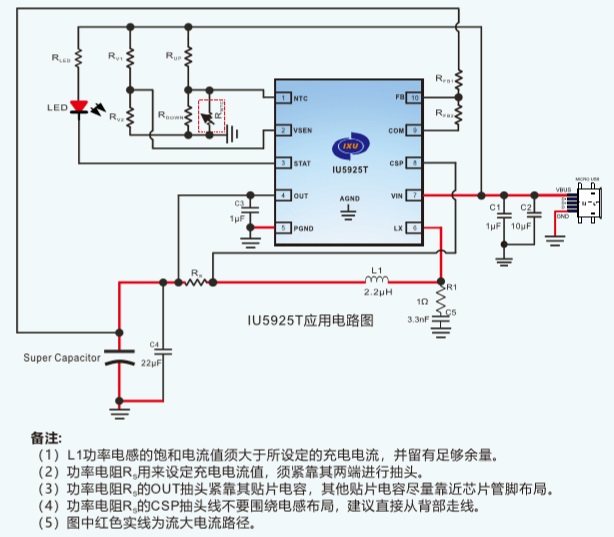 IU5925T通過調(diào)節(jié)外部反饋電阻的分壓比例,得到不同的恒壓充電電壓值,從而適配不同規(guī)格的超級電容。IU5925T具有完善的保護功能,包括輸入欠壓/過壓保護、輸出過壓、電池溫度保護NTC功能、芯片溫度保護。此外芯片通過外接的LED指示燈對充電過程實現(xiàn)全程監(jiān)控。