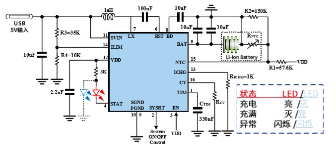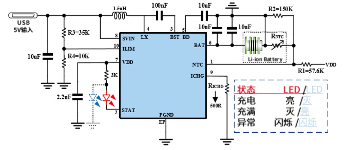 ■ LED指示燈使用時(shí)需接限流電阻到VDD,推薦3K。如需使用雙燈方案,必須按照?qǐng)D中LED燈顏色配置,請(qǐng)購(gòu)買(mǎi)對(duì)應(yīng)顏色LED燈進(jìn)行實(shí)驗(yàn),充 電時(shí)紅燈亮,藍(lán)燈滅;充滿時(shí)藍(lán)燈亮,紅燈滅;異常時(shí)紅燈藍(lán)燈交替閃爍。