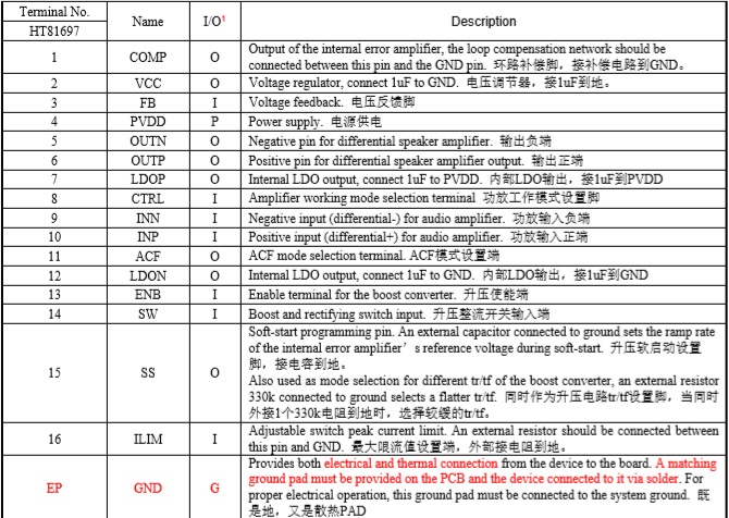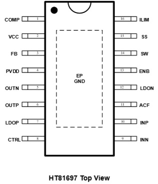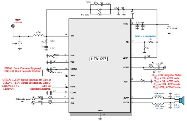 HT81697具有先進(jìn)的擴(kuò)頻功能來抑制EMI。如果系統(tǒng)對EMI高度敏感,則可以將升壓關(guān)閉,并將功放切換到AB類。 此外,HT81697集成了輸出端過流保護(hù)、片內(nèi)過溫保護(hù)、升壓過壓保護(hù)等功能。