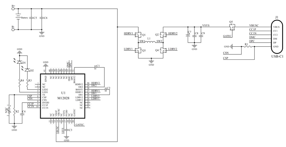 M12028是一款面向小家電、電動工具、戶外藍牙音箱等充電的快充管理SOC,集成了同步開關電壓變換器、快充協(xié)議控制器、電池充放電管理、電池電量計算等功能模塊,支持PD3.0、PD2.0、QC3.0、QC2.0、BC1.2 DCP、UFCS快充充電協(xié)議,額定充電功率100W,并提供輸入過壓/欠壓、電池過充、過溫、過流等完備的保護功能。搭載極簡的外圍電路,即可組成2-4節(jié)電池的快充充電解決方案。 |