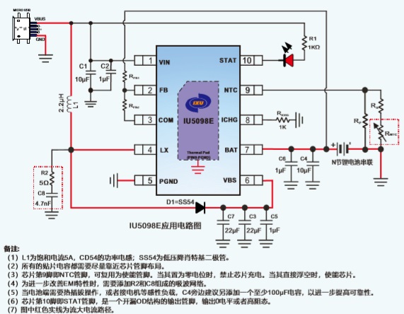 IU5098E是—款5V輸入,最大2A充電電流, 支持2-3節(jié)鋰離子電池/磷酸鐵鋰電池串聯(lián)應(yīng)用的升壓充電管理IC。IU5098E集成功率MOS,采用異步開關(guān)架構(gòu) ,使其在應(yīng)用時僅需極少的外圍器件,可有效減少整體方案尺寸,降低BOM成本。IU5098E的升壓開關(guān)充電轉(zhuǎn)換器的工作頻率為500KHz,轉(zhuǎn)換效率為90%。