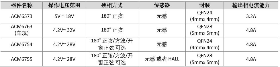ACM6754支持多種驅(qū)動(dòng)方式,包括無感180゜正弦驅(qū)動(dòng)、無感方波驅(qū)動(dòng),有感方波/正弦驅(qū)動(dòng)以及開窗正弦驅(qū)動(dòng).其中無感180゜正弦有效避免因高次諧波導(dǎo)致的電磁音干擾,有感方波/正弦驅(qū)動(dòng)可以有效應(yīng)對(duì)變負(fù)載類應(yīng)用.