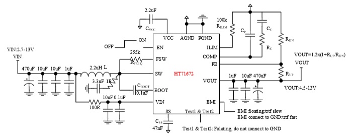 HT71672具有2.7V至13V寬輸入電壓范圍,可為采用單節(jié)或兩節(jié)鋰電池的應用提供支持。該器件具備12A開關(guān)電流能力,并且能夠提供13V的輸出電壓。