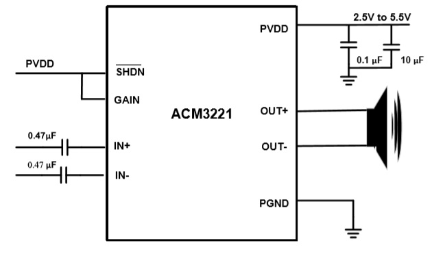 主動(dòng)跟蹤限制、邊緣速率和超調(diào)控制電路大大降低了EMI。無濾波器擴(kuò)頻調(diào)制方案消除了對(duì)傳統(tǒng)D類設(shè)備中的輸出濾波器的必須配備。這些功能大大簡化了外圍應(yīng)用,節(jié)省PCB面積。ACM3221在3.7V時(shí)靜態(tài)功耗<1.2mA(5V時(shí)約1.5mA),超低靜態(tài)電流延長便攜式電池的壽命應(yīng)用。
