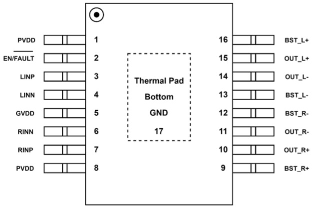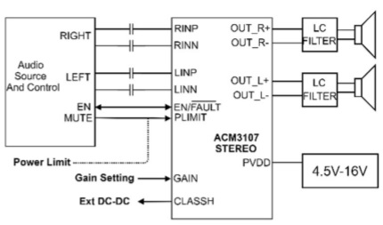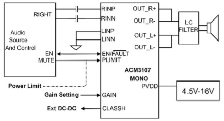 ACM3107工作電壓范圍4.5V-16V,輸出配置可選用立體聲BTL,也可選用單聲道PBTL。