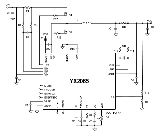 產(chǎn)品名稱: YX2065(4V-65V寬電壓輸入,30A大電流同步降壓控制器芯片)