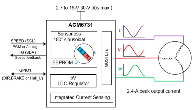 ACM6731是一款三相無刷直流電機驅動芯片,內部集成無感三相無刷電機驅動算法、相電流檢測電流電路、柵極驅動電路以及功率MOS管. 支持最大2.4 的相電流.