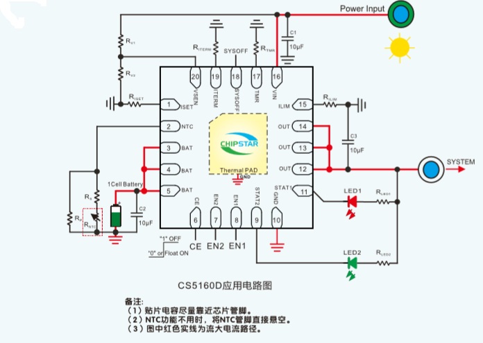 CS5160D具有完善的保護功能,包括輸入欠壓和過壓保護、輸出欠壓和過壓保護、芯片溫度調(diào)節(jié)和保護,充電超時保護、電池過壓和短路保護、電池溫度保護。此外芯片通過外接的兩路LED指示燈,可對充電過程實現(xiàn)全程監(jiān)控。