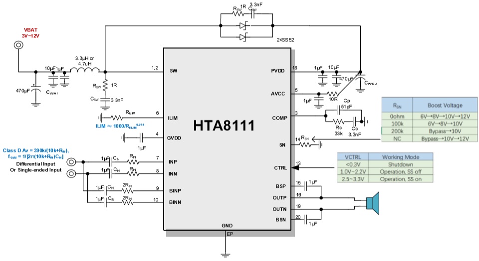 HTA8111內(nèi)置可動(dòng)態(tài)調(diào)節(jié)的升壓,可以提供一個(gè)適應(yīng)不同輸出功率的電壓給D類功放,其可大幅提高系統(tǒng)效率,延長(zhǎng)電池續(xù)航時(shí)間。