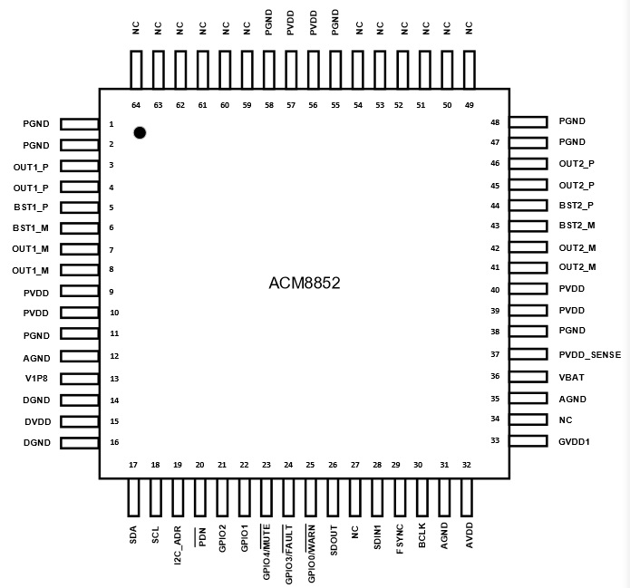 ACM8852 一款高度集成、高效率、低EMI的雙通道數(shù)字輸入D類音頻功放。
